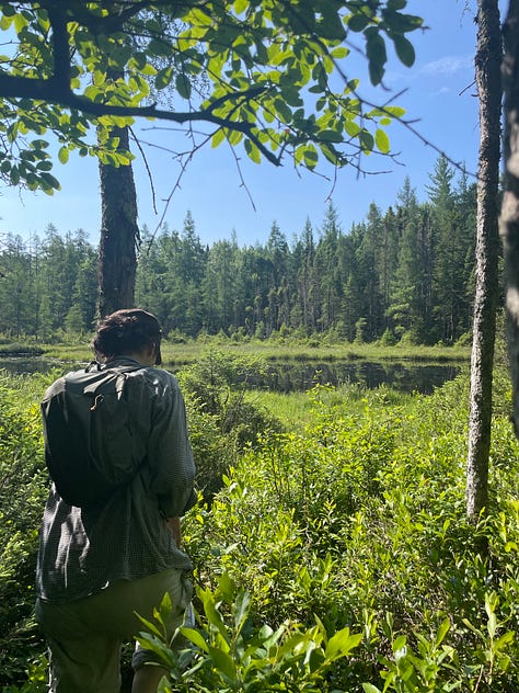Our excursion this day took us to the SUNY-ESF Ranger School at Wanakena, on the southwest arm of the lake. The boat driver dropped our group of four off at a partially sunken dock on the edge of an old-growth forest. We had to leapfrog carefully from boat to shore to avoid slipping into the water. Once onshore, we were on our own - with no cell service, only a 2 o’clock rendezvous when the boat would return for us.