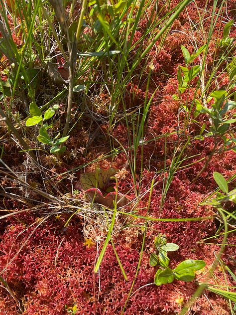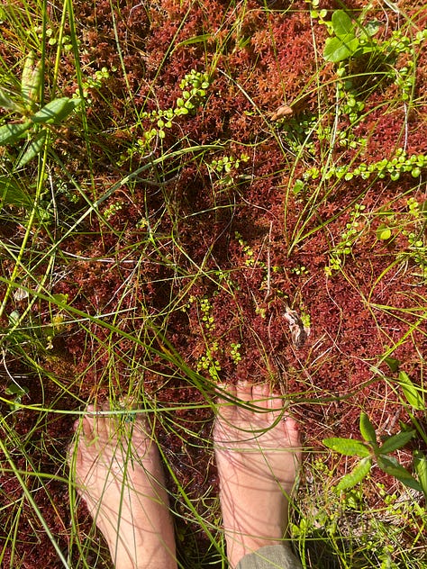 We passed through the woods — encountering a white oak so old and enormous I couldn’t see where its branches ended — and found ourselves among tamaracks. The tamaracks opened up onto a sunny pond — our kettle bog. The ground glittered with water and the dewy leaves of Drosera plants. What surprised me most was the springiness of the ground. The surface was built of layer upon layer of sphagnum moss. Many different species carpeted the ground, colored an autumnal red or lime green. As the generations of mosses decayed, they built the ground that I stood on. If I jumped, the ground quivered like a trampoline, shaking a nearby tamarack sapling. I abandoned my shoes at the forest edge and stepped out onto the soft, squishy moss.
