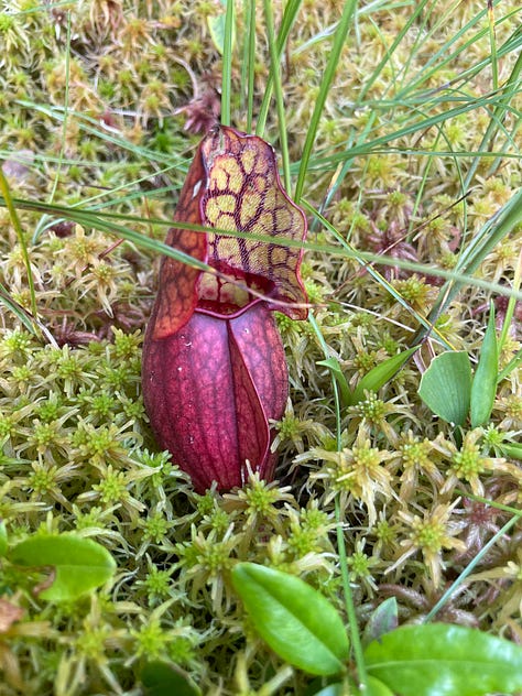 Some other delightful inhabitants of the kettle bog were the purple pitcher plant (Sarracenia purpurea), rose pogonia (Pogonia ophioglossoides), and golden strands of bladderwort (Utricularia spp.). The purple pitcher plant had shot up from its pale green stalk a maroon flower. Below, its leaf gaped its darkly veined throat, hungry as a frog. A species of pitcher plant (Sarracenia rosea) is found on the Gulf Coast of Florida, and used to be classified as a variety of S. purpurea. I had discovered it once a few years ago in a ditch in the Apalachicola National Forest, so it was like bumping into an old friend.